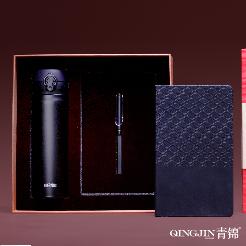 配置 膳魔師保溫杯480ML*1 錦翼筆記本*1 顏色黑色/紅色/彩印色 簽字筆*1 手提袋套*1 精裝禮盒*1 材質(zhì) 保溫杯:304鋼 簽字筆:abs 筆記本:皮革千越象牙白紙100克80張 定制工藝 激光 鐳射 印刷 燙壓印 尺寸 筆記本:130*212mm 保溫杯:220*60*60mm 禮盒:272*272*83mm